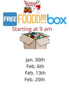 The Bulldog Pantry will be continuing to hand out large combination food boxes through February. Please see the schedule for exact dates and details. The boxes contain fresh produce, meat & dairy produces. Each week we will start handing them out at 9am. There is a limited supply so it is first come first serve.