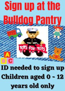It is Toys for Tots season once again. We are accepting registrations at our up coming food distributions. Sign ups are for children ages 0 – 12 years. The adult responsable for the children is the one who needs to sign up. To do that they need to show us some form of identification. That same identification will be needed to pick up the toys. We also will need a working phone number or email address to contact you when the toys arrive.