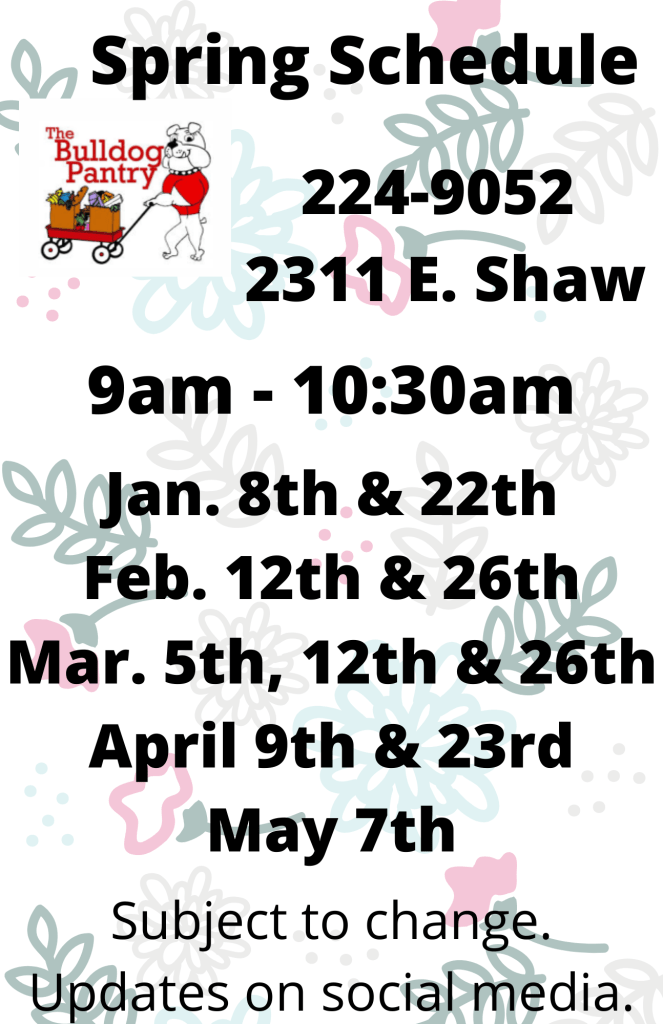 We are happy to announce our spring pantry schedule. On these days you will come inside our pantry to select your foods. Please share this information with anyone who needs it.