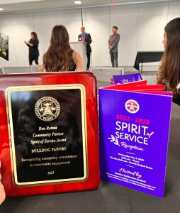 On May 3rd the Bulldog Pantry was honored with the Don Romsa Spirit of Service Award from Fresno State University. The award recognizes a local community benefit organization that has demonstrated an exceptional commitment to partnering with Fresno State faculty, students, and staff and has had a positive, lasting impact on the communities they serve.