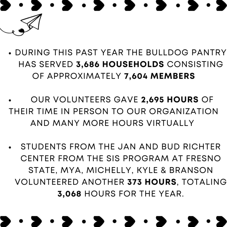 This is to show what the Bulldog Pantry has achieved in the past year. Wouldn’t have been possible without our wonderful volunteers. The hard work and dedication everyone brought allowed this pantry to help out neighboring communities who suffer from food insecurity. We hope to continue our services and help those in need. Visit our website at: Thebulldogpantry.org