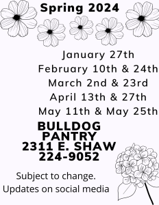 Unopened nonperishable food items will be collected on Saturday April 6th from 1pm – 5pm at the Bulldog Pantry. There will be no food given away at this event. The drop off will be behind the pantry building. Please enter off of Shaw and volunteers will be there to unload your donations. All donations collected will help us to continue to feed those in need in our community.