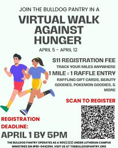 The Bulldog Pantry is holding a virtual walk fundraiser on April 22 from 5am through April 24th at 7pm. Join us to help the pantry and stay active and healthy at the same time. For registration information click here.