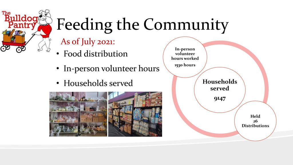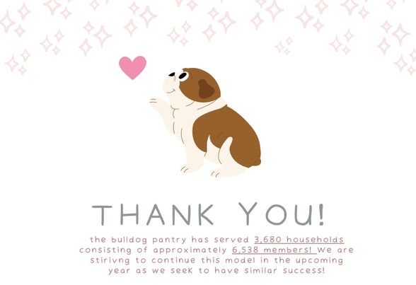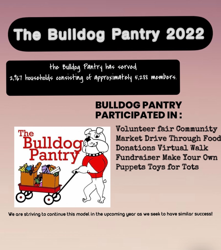 This is to show what the Bulldog Pantry has achieved in the past year. Wouldn’t have been possible without our wonderful volunteers. The hard work and dedication everyone brought allowed this pantry to help out neighboring communities who suffer from food insecurity. We hope to continue our services and help those in need. Visit our website at: Thebulldogpantry.org