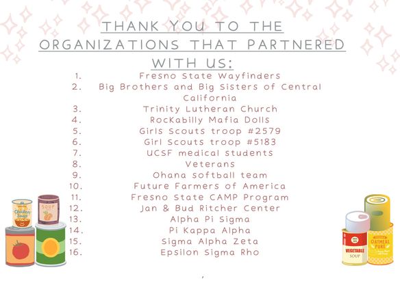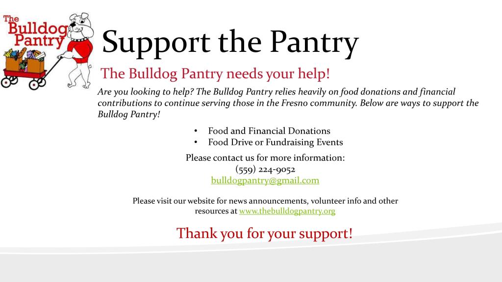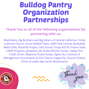 Many local businesses have donated food and supplies to the Bulldog Pantry in the last month. Fruit Filling Inc. , Summit Surgical, Actagro, Sun-Maid Growers of California, Schnitzer Steel Industries, California Dairies Inc., Copper Beech, Allied Universal, the Church of Jesus Christ of Later- Day Saints and Save Mart Supermarkets.