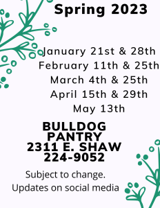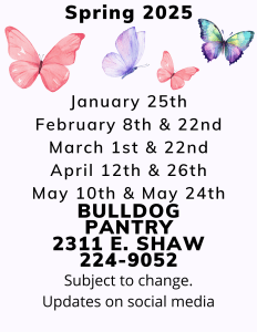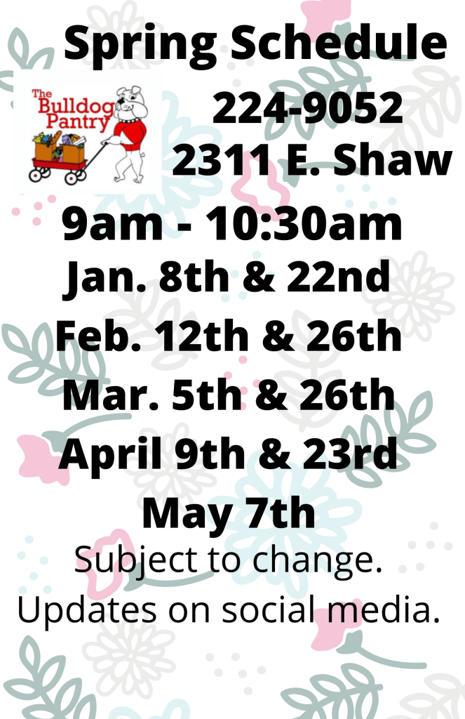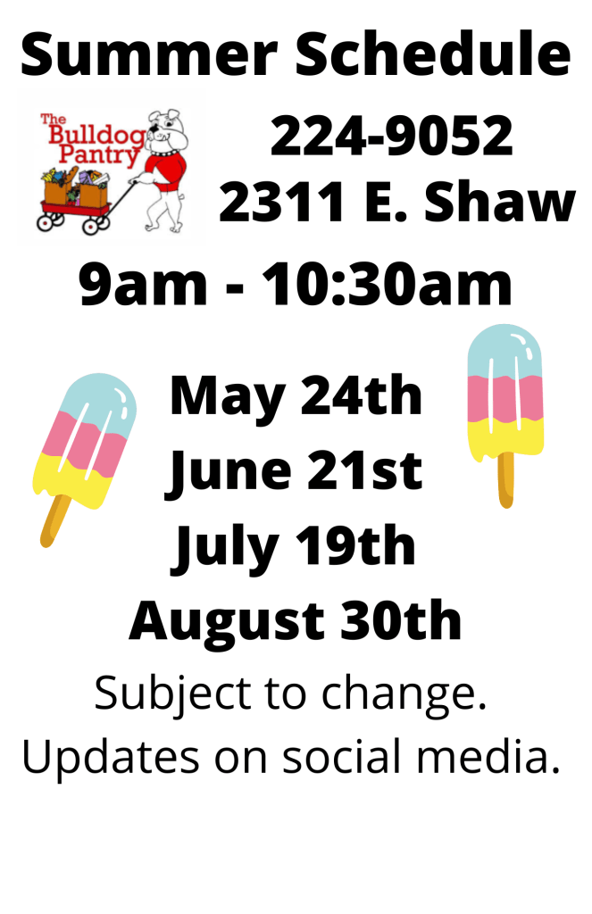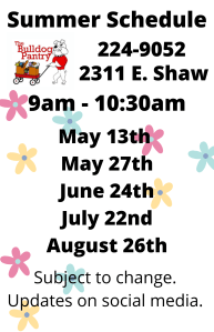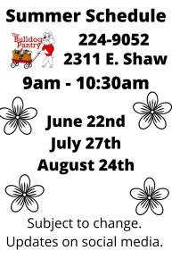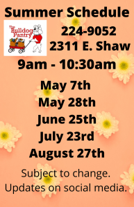 Our summer schedule is here. The Bulldog Pantry will be open one Saturday a month from 9am – 10:30am. Please see the schedule below for the dates. This schedule is subject to change. Any changes will be posted on our social media pages.