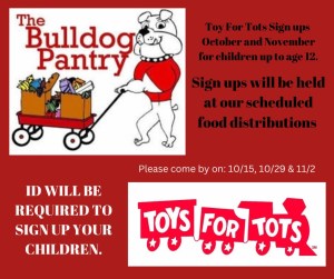 It is Toys for Tots season once again. We are accepting registrations at our up coming food distributions. Sign ups are for children ages 0 – 12 years. The adult responsable for the children is the one who need s to sign up. To do that they need to show us some form of identification. That same identification will be needed to pick up the toys. We also will need a working phone number or email address to contact you when the toys arrive. Sign ups will be taken on Saturday October 30th, November 6th & November 13th.