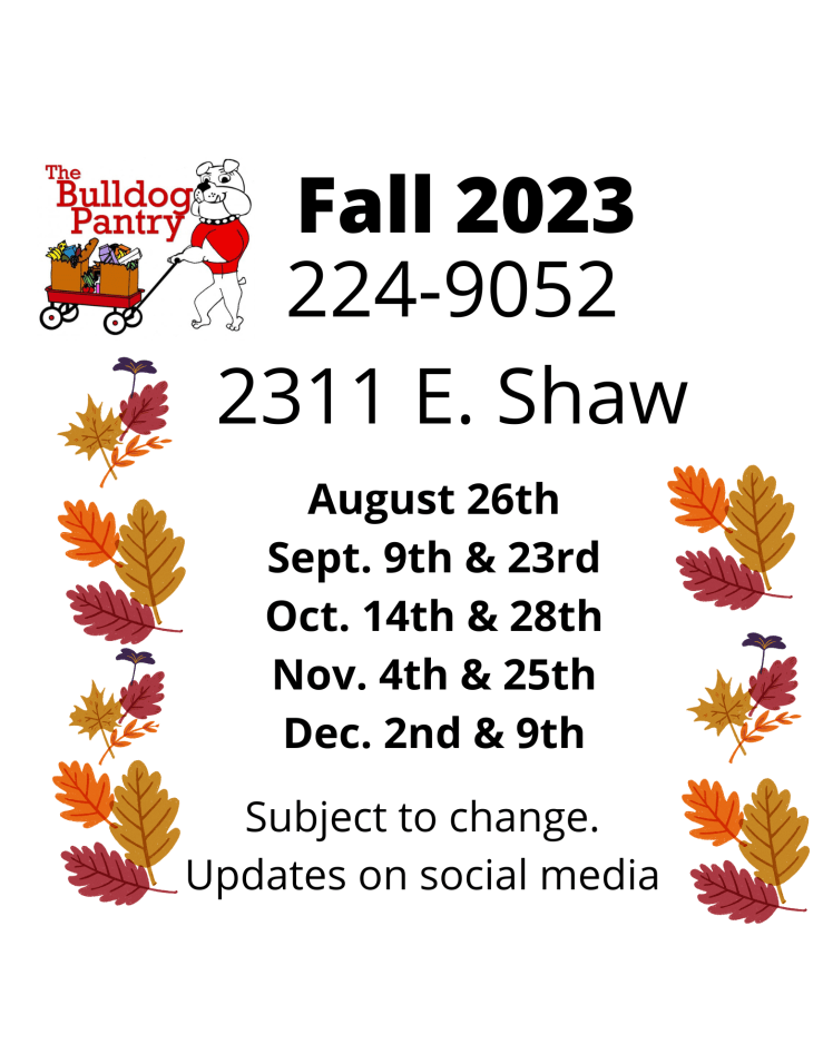 There are many ways to donate to the Bulldog Pantry during the fall. Local elementary schools are collecting food for us as are some local businesses. We are doing the same at our Drive Through Food Collection Drive on Saturday November 12th from 10am – noon at 5685 N. Cedar.