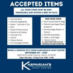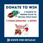 Several area buinesses and groups are collecting food for the Bulldog Pantry. The Retired Fresno County Employees were very generous with their donations. Both Valley First Credit Union and Kasparian’s Paint Center are currently collecting. If you donate at Kasparian’s Paint Center before 9/22 and be entered to wing free Fresno State football tickets for the game on September 30th.