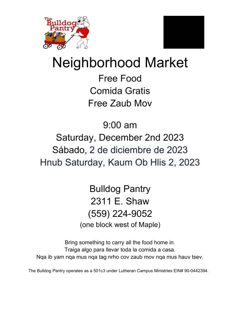 On Saturday December 5th from 9am – 11am the Bulldog Pantry will be holding a Neighborhood Market distribution. This distribution will be mostly fresh food. Please bring a cart or wagon if you have one. You will need it to carry all of your food.
