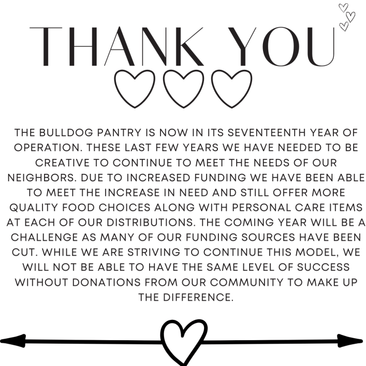 We are very proud of all the work we have done in 2023! None of it would be possible without all of our donors. Those who give their time and those who give their treasures allow us to continue the work of the Bulldog Pantry. Looking forward to a great 2024!